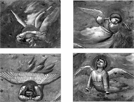 Картины Джотто всегда диалоги на сцене. Диалоги внутренние – героев между собой. И диалоги внешние – с нами, зрителями. Он первый, кто чудо «явления» раскрыл через реальное действие. Состояние невесомости заменила сила земного притяжения на сцене жизни, на земле. Посмотрите на фрески. Не герои похожи на ангелов (см. «Оплакивание Христа», «Бегство в Египет» и др.), но ангелы тяжелы и плотны, подобны людям. Они страдают, ликуют, плачут, они наши хранители и подобия. Можно сказать проще: основой композиции картин Джотто впервые становится литературный рассказ. Изображение подобно слову, несет словесную нагрузку. Для живописи эпохи Возрождения, начиная с Джотто, причинно-следственное видение изобразительного рассказа становится тем, что мы называем театром.