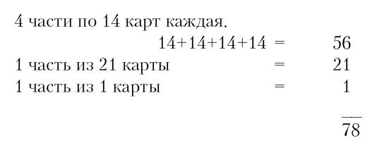 Последовательность картинок представлена в трех мирах числами; то же самое имеет место в последовательности мастей: Скиперты, Чаши, Мечи, Пентакли представлены в картинках.