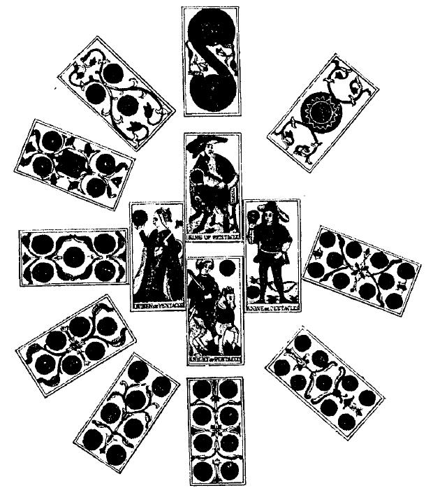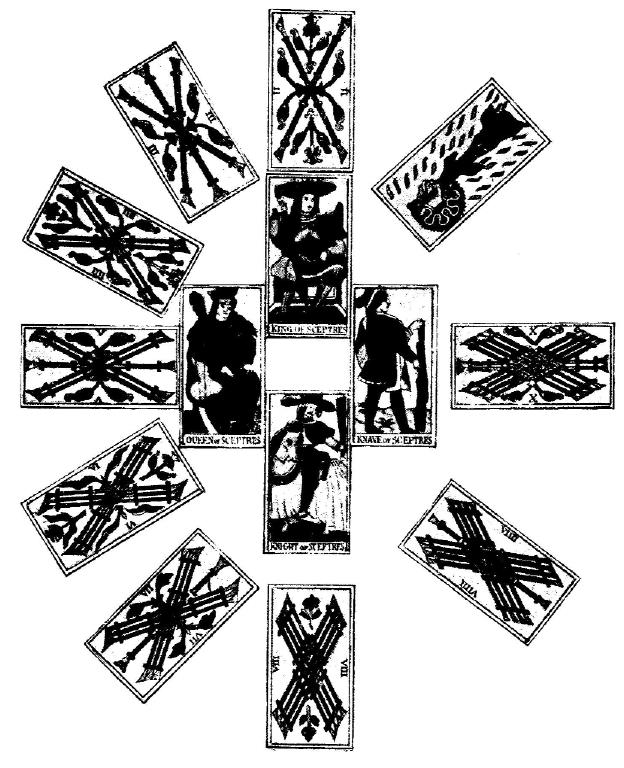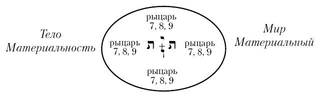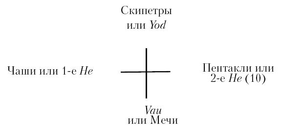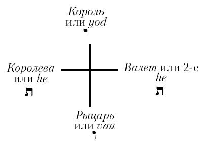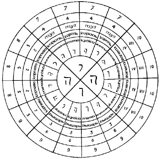 Чтобы представить этот порядок в виде синтетической схемы, надо поместить Священное Имя в центре круга, разделенного на четыре части, каждая из которых соответствует буквам yod-he-vau-he. В каждой четверти из центра круга лучами будут расходиться карты, аналогичные буквам Тетраграмматона.