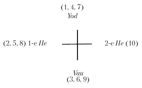 Последовательность чисел 1, 2, 3 и 4, представляющая активный, пассивный, нейтральный и второй активный принцип, по всем пунктам соответствует ряду букв Священного Имени, так что последнее можно записать как —