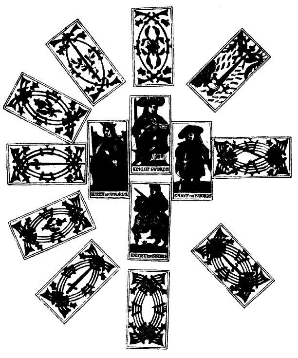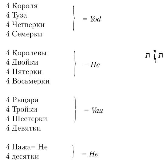 Четыре придворные карты представляют Yod – he – Vau – he; четыре серии номерных уврт представляет нам Священное имя в мой же манере.
