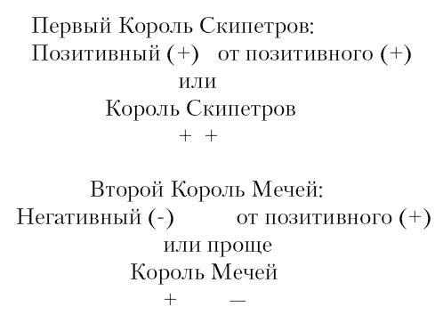 Каждый элемент может быть взят в двух главных значениях: в позитивном (+) или негативном (—). То же правило применяется в подразделениях этих элементов.