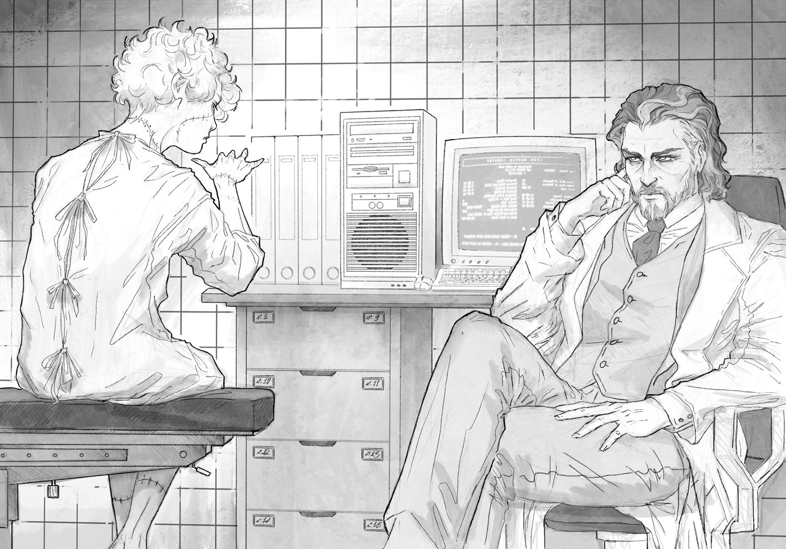 Он тянется к рубильнику, и с громким хлопком гаснет свет. С непривычки мир становится тёмным, скользким и рыхлым, как сырая земля, но, когда глаза привыкают, проступает множество незнакомо знакомых вещей: кафель, операционные софиты, решётки на окнах, тяжёлый монитор в пожелтевшем пластике, заваленный бумагами стол, стальные архивные шкафы, склянки, схемы, лезвия и ещё слишком много того, от чего всё внутри сжимается, – я не знаю их имён, но знаю: оно способно навредить.