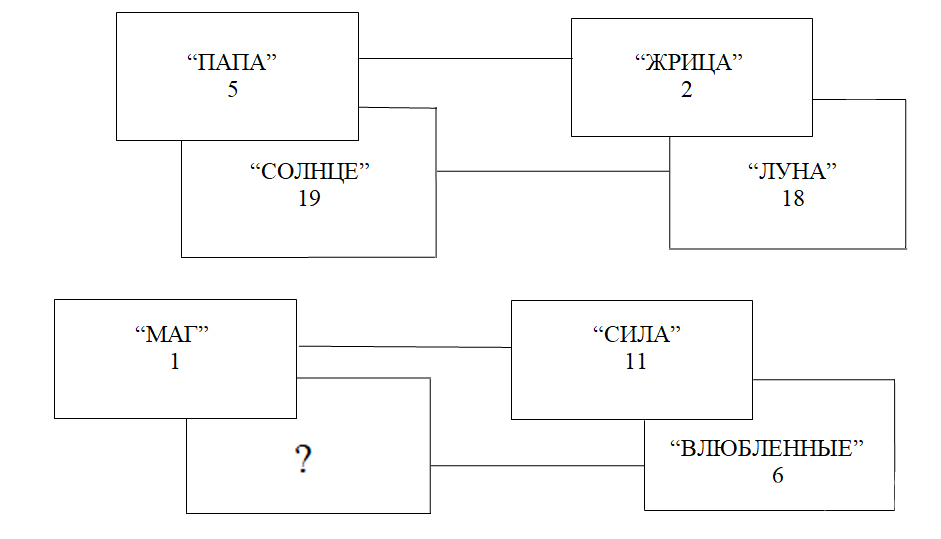 Если разложить три указанных выше карты, то для людей, хоть немного практикующих ТАРО, не составит труда найти в колоде Старших Арканов недостающую карту: карте “Папа” должна сопутствовать женская, немолодая фигура, сидящая на троне. Ни третий Аркан (“Императрица”), ни восьмой (“Правосудие”) не подходят как спутники “Папы” ни по возрасту, ни по названию, ни по рисунку и его мыслесиле. Если положить пятый и второй (кстати, двойка в нумерологии – самая женская, материнская цифра, ведь беременная женщина олицетворяет сразу двух людей) Арканы Марсельского Таро рядом, как на схеме, то мы увидим, как два похоже одетых пожилых человека печально смотрят друг на друга.
