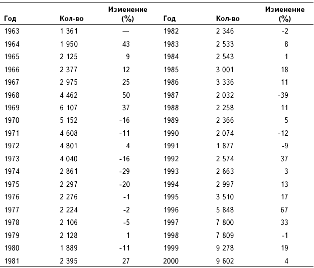Таблица 1.2. Объявления о слияниях и поглощениях в США, 1963–2000 гг.