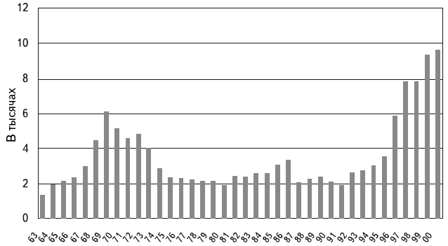 Рисунок 1.1. Объявления о слияниях и поглощениях в США, 1963–2000 гг.