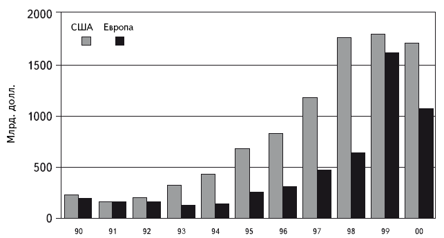Рисунок 1.3. Слияния и поглощения в США и Европе (в долларах США), 1990–2000 гг.