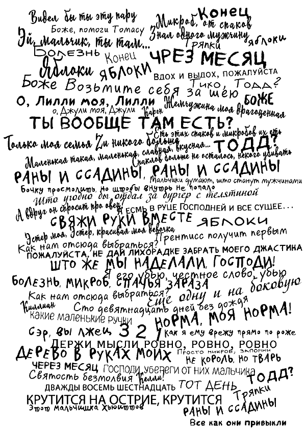 Идучи мимо церковного крыльца, мы с Мэнчи держимся тише воды ниже травы. Изнутри несется молитвенный Шум – у него особый вкус, пурпурный такой и тошнотный, будто там люди кровью текут. Шум вечно один и тот же, да только кровь не кончается.Помоги нам, спаси нас, прости нас, помоги нам, спаси нас, прости нас, избави нас, уведи отсюда, пожалуйста, Боже, пожалуйста, Боже, пожалуйста, Боже,хотя, насколько я знаю, никто еще ничего не слышал от этого их бога в ответ – никакого Шума.