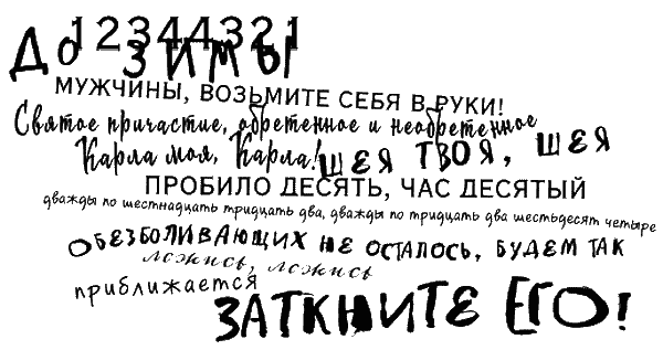 Я машинально поворачиваю голову, хоть и знаю, што не хочу, но иногда тебя вот так ловят врасплох, и я поворачиваю голову, а в окне стоит мистер Моллот и глядит прямо на меня;один месяц, думает он, и из егойного Шума проступает картинка: я стою один, сам по себе, но как-то даже еще более одиноко – я не знаю, што это значит, и реально ли оно вообще, или это нарочная ложь, и я представляю, как молоток бьет мистера Моллота по голове – раз, еще раз, еще раз, – а он все стоит и улыбается мне из окна.