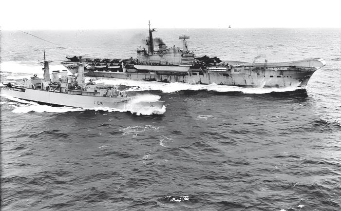 Фрегат F88 «Бродсуорд» охраняет флагман адмирала Вудварда авианосец R12 «Гермес»