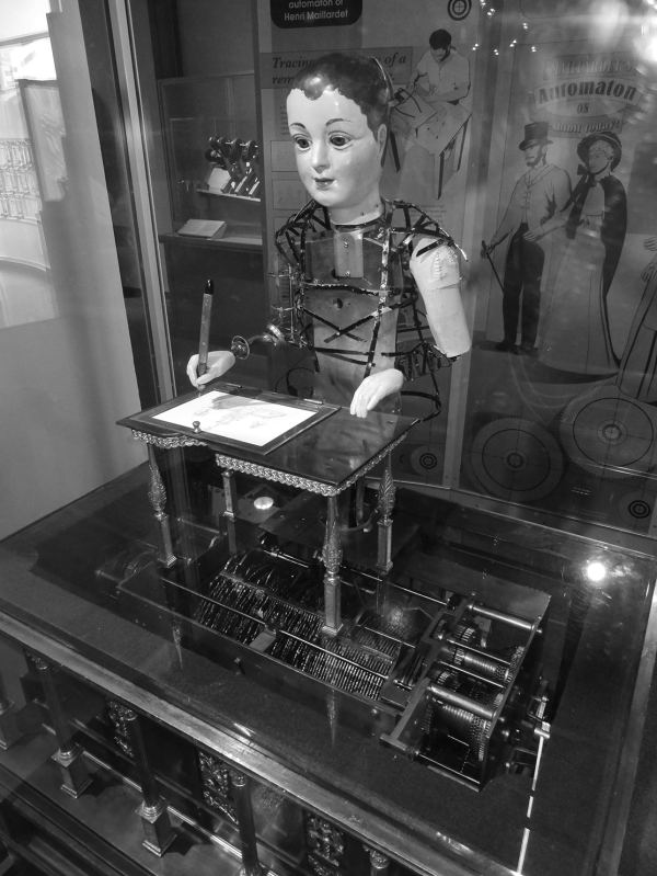 Большинство людей не считают автоматы вроде миниатюрного монаха Турриано роботами. Один из аргументов против данного подхода заключается в том, что они совершают только механические действия: у них нет гибкости и их, выражаясь современным языком, нельзя программировать. Но работы швейцарского часовщика Пьера Жаке-Дроз второй половины XVIII века демонстрируют, что это не совсем так. В Музее искусства и истории в Невшателе, Швейцария, хранятся три автомата, созданные этим мастером: Музыкант, Художник и Писатель. Это куклы с очень сложными механизмами. Музыкант состоит из 2000 деталей, Художник из 2500, а Писатель из Музыкант играет на миниатюрной клавиатуре, причем действительно нажимает на клавиши: в устройстве не используется никакой музыкальный автомат. Его голова и глаза следят за движениями пальцев, а грудь имитирует дыхание. Художник рисует четыре разных картинки, периодически дуя на карандаш, чтобы стряхнуть пыль. В каком-то смысле он предвосхищает современную механическую руку, рисующую портреты[20]. Писатель, – самый сложный из трех автоматов и, с современной точки зрения, самый любопытный. Он может написать любую строку из сорока знаков. В его механизме есть колесико, на котором можно выставить эти сорок знаков, так что он – программируемый, хоть и через материальную часть, а не программное обеспечение. Высота Писателя чуть больше метра; пишет он гусиным пером, которое периодически макает в чернила и стряхивает излишки. Как у Музыканта, его глаза следуют за текстом. Он обладает многими возможностями современных роботов, но приводится в действие заводным механизмом. Его вполне можно назвать «первым роботом», если забыть о том, что он не взаимодействует со средой и не принимает решений в реальном времени. Все его действия определены заранее.