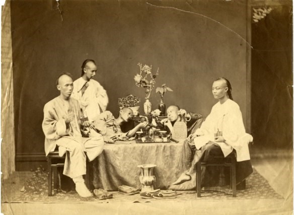 Al contrario de lo que se cree en China el opio no se utilizaba con los mismos fines de vicios y patológicos que en Occidente, sino que su uso era para un fin terapéuticos y religioso. Solo más tarde con la caída del imperio Qing y con las guerras Anglo-Chinas de 1830/40 que el opio fue deliberadamente distribuido por Inglaterra misma con generosidad a la población china, con el objetivo de aumentar su monopolio y transformar gran parte de las plantaciones agrícolas necesarias en plantaciones de opio destinadas a la exportación por todo el mundo. China intento frenar la difusión, pero resulto ser inútil. Debido a las migraciones en América la mala costumbre y los tráficos relacionados con ella desembarcaron en América administrados, mediante acuerdo, tanto por la Mafia China como por el mismo Gobierno de los Estados Unidos. En la foto una clasica sala de opio China en 1890.