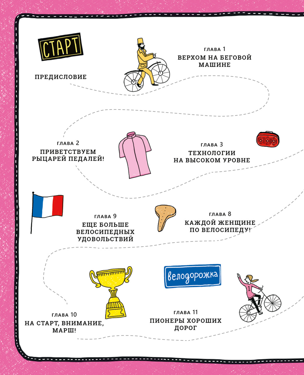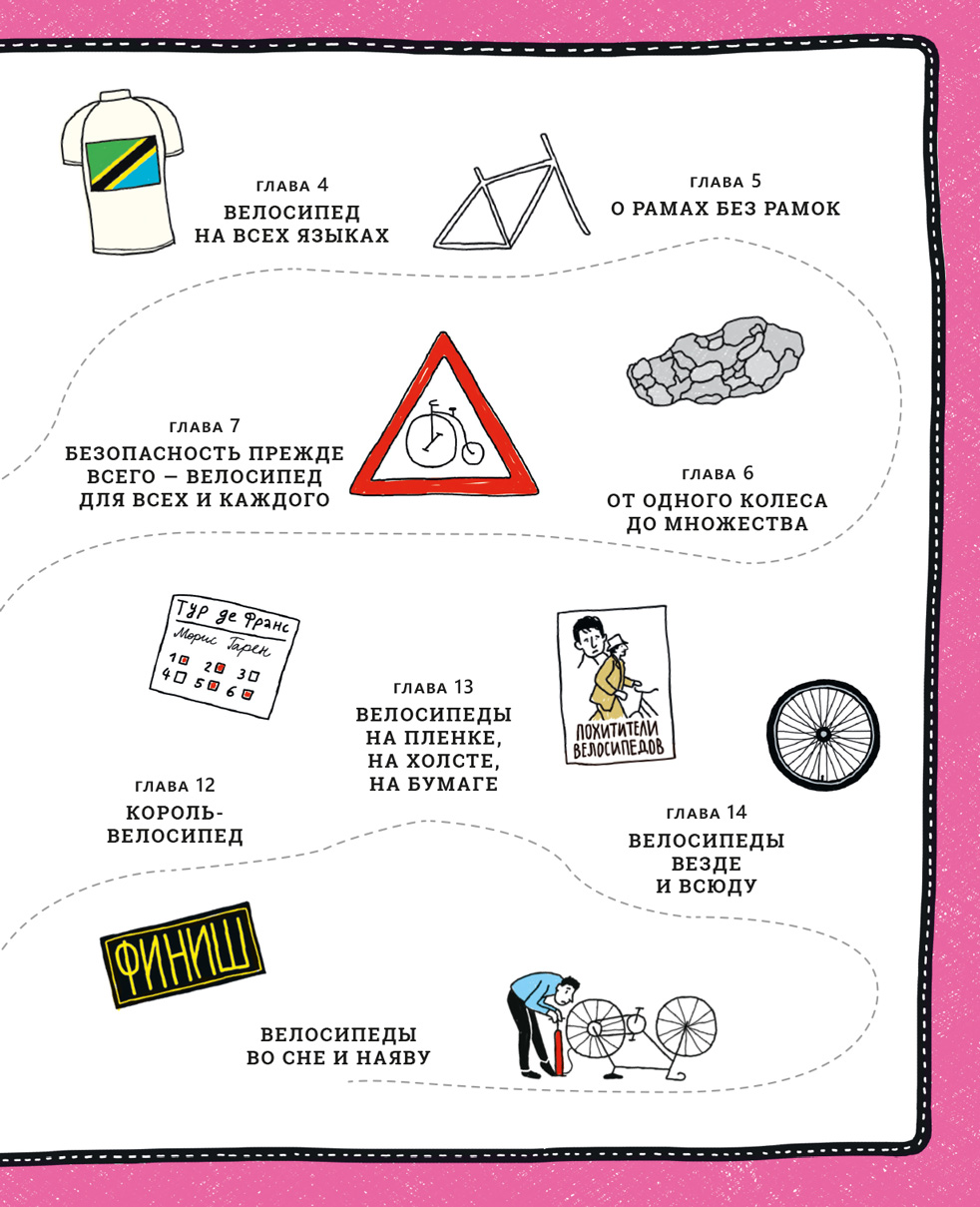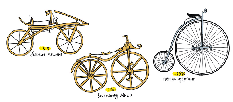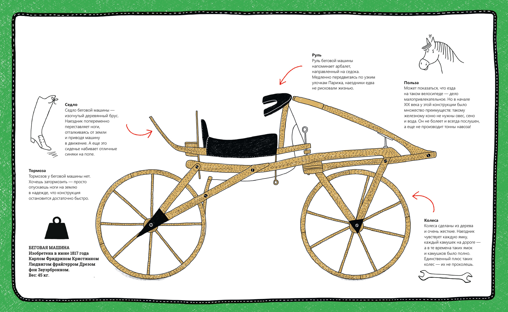 Многие изобретения могут побороться за титул лучшего в истории. Колесо, например. И очки. И карандаш. Мороженое в вафельном стаканчике. Смартфон. Видеопленка. Стул. Плюшевый мишка. Подгузники. Школа. Что? Да-да, она самая. Компьютерные игры. Лампа. Интернет. Книга. Список бесконечен. Тут, конечно, есть о чем поспорить. Но зачем, если существует одно изобретение, которое уверенно выйдет в победители? Это велосипед. Когда в 1817 году появилась первая его версия, люди распахнули от удивления рты – и с тех пор так и не закрывали. Ведь прежде никто и подумать не мог о том, чтобы вот так, друг за другом, катиться на двух колесах! Причем катиться очень быстро благодаря силе мышц. И к тому же преодолеть гравитацию и добиться удивительного равновесия. Велосипед наполнил нашу жизнь новым смыслом, задал ритм и направление: вперед, вперед!