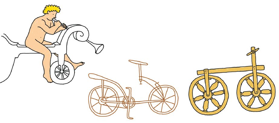 О первых велосипедах ходит множество легенд и фантастических историй. Например, в 1974 году один итальянский профессор заявил, что в дневниках Леонардо да Винчи (1452–1519) есть чертеж двухколесного транспортного средства со спицами, педалями, цепью и рулем. По словам ученого, первое в истории изображение велосипеда так долго оставалось неизвестным, потому что листок с ним застрял между двумя склеенными страничками. Исследователи рассмотрели чертеж под микроскопом и пришли к неутешительному выводу: рисунок сделал в 1960-е годы итальянский монах, который реставрировал книгу. Видимо, его манила карьера шутника.