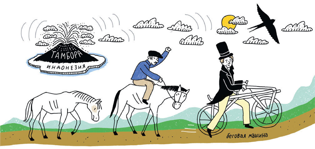 На дворе апрель 1815 года – время непростое. В Индонезии начинается чудовищное извержение вулкана Тамбора. К небу поднимаются столбы пепла. Потоки лавы растекаются во все стороны на 40 км от жерла. По всему миру весенние дни превращаются в осенние ночи, а лето напоминает чуть теплую зиму. Земля остывает. Растения чахнут, урожая почти нет, торговля остановилась. Во всех краях царят болезни, смерть и разрушение. Проповедники трубят о скором конце света и Судном дне. На лошадей жаль смотреть: ребра так и торчат. Животные гибнут – в конюшнях, на улицах. Людям срочно нужен новый транспорт, удобный и экономичный, чтобы заменить конную тягу и возродить экономику. В этой удручающей ситуации барон Дрез фон Зауэрбронн объявляет себя спасителем: «Не бойся, человечество, я иду на помощь!»