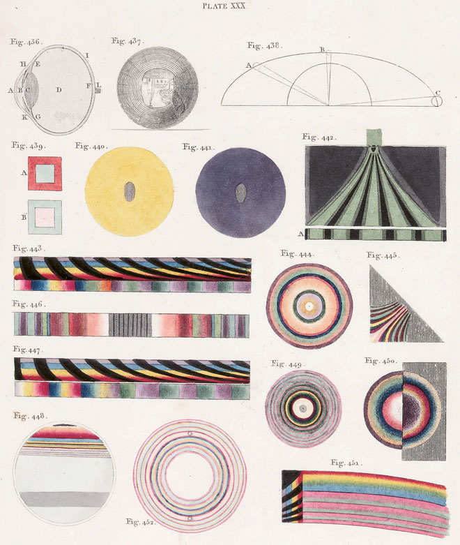 Взгляды Ньютона разделяли далеко не все. Джон Китс, как известно, сетовал на то, что Ньютон «разрушил поэзию радуги, сведя ее к призме», а немецкий поэт и естествоиспытатель Иоганн Вольфганг фон Гёте в своей книге «Учение о цвете» (1810) горячо отстаивал точку зрения, что цвет – это нечто субъективное, а не чисто научное явление. Цвет, утверждал Гёте, возникает как результат взаимодействия между физическим поведением света и аппаратом, с помощью которого мы его воспринимаем. В соответствии с этим Гёте разделил спектр на улучшающие жизнь «положительные» цвета (желтый, желто-красный) и вызывающие тревогу «отрицательные» (синий, фиолетовый и сине-зеленый). Философ Людвиг Витгенштейн заметил: «На самом деле Гёте искал не физиологическую, а психологическую теорию цвета».