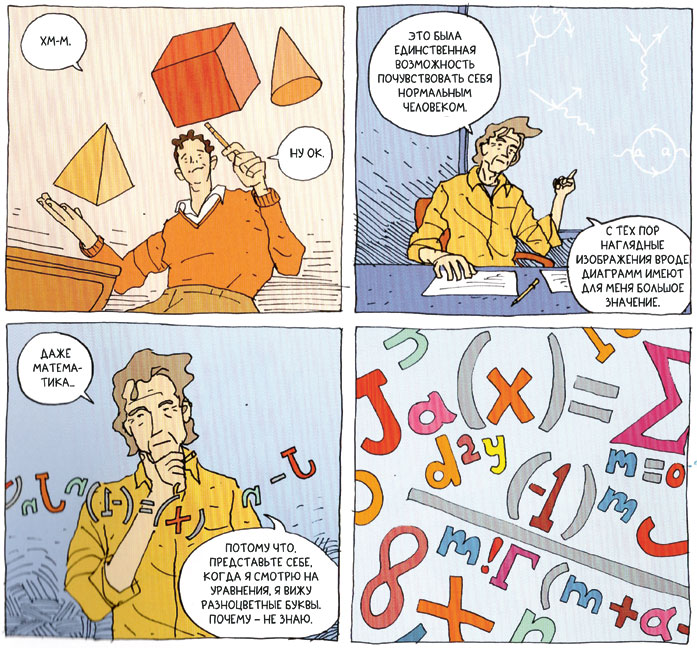 Нобелевский лауреат по физике Ричард Фейнман был синестетом, из-за чего видел уравнения разноцветными. Вот как представили это Джим Оттавиани и иллюстратор Лелан Мейрик в графическом романе о жизни Фейнмана