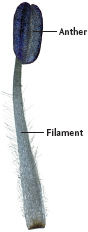 In a few species, male and female sex cells are borne in separate flowers, or even on different plants, but in most cases they appear together within the same flower. Male sex cells are contained within pollen, tiny grains that are produced by structures called anthers and borne on slender stems referred to as filaments; collectively, anthers and filaments are referred to as stamens. The female part of most flowers comprises the ovary, containing the female sex cells, above which is borne the stigma (which receives the pollen) carried on a stem called the style.