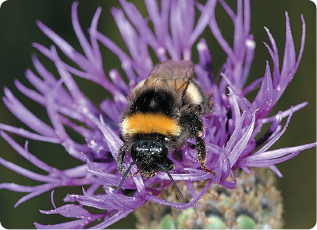 Bumblebees, and bees generally, are the classic insect pollinators. They visit flowers in search of nectar and unwittingly acquire a dusting of pollen, which is slightly sticky, on their hairy bodies; this is then carried to subsequent flowers they visit.