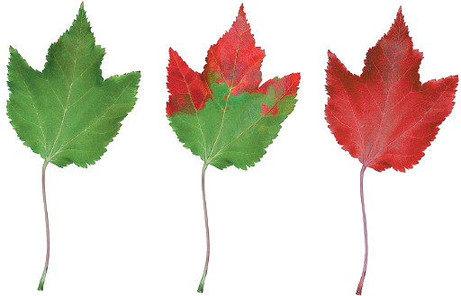 Autumn leaf colour is spectacular in many maple species: as chlorophyll and other pigments are withdrawn, remaining red pigments prevail.