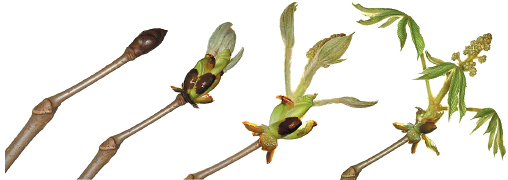 Deciduous trees, such as Horse-chestnut, produce fresh leaves each spring, which burst forth from buds.