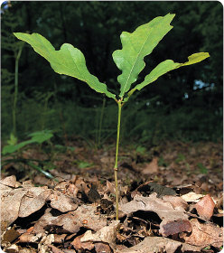 The first pair of leaves to emerge from the seed are simple, and bear no resemblance to the true leaves of the tree; they are derived from the seed’s food store. They are green, however, and supply the tiny seedling with its first food made from sunlight energy. Once the seedling has begun to produce leaves that are miniature versions of its true leaves, growth can begin very rapidly. Tiny seedlings are vulnerable to grazing, trampling, drought and competition, so very few survive.