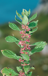 Much-branched annual of bare soil and open ground. FLOWERS Pale pink, in leaf axils (June–Oct). FRUITS Nut-like, enclosed by the withering flower. LEAVES Oval, leathery, alternate with a silvery basal sheath; main stem leaves larger than those on side branches. STATUS Widespread and common.