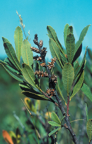 Woody, brown-stemmed shrub that is characteristic of boggy habitats, usually on acid soils. FLOWERS Orange, ovoid male catkins or pendulous brown female catkins; on separate plants (Apr). FRUITS Brownish nuts. LEAVES Oval, grey-green, smelling of resin when crushed. STATUS Widespread but local; sometimes locally dominant.