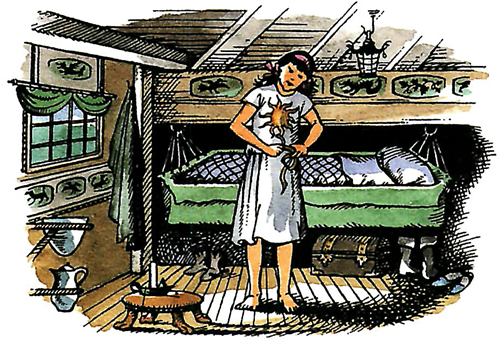 Lucy found herself as much at home as if she had been in Caspian’s cabin for weeks, and the motion of the ship did not worry her, for in the old days when she had been a queen in Narnia she had done a good deal of voyaging. The cabin was very tiny but bright with painted panels (all birds and beasts and crimson dragons and vines) and spotlessly clean. Caspian’s clothes were too big for her, but she could manage. His shoes, sandals and sea-boots were hopelessly big but she did not mind going barefoot on board ship. When she had finished dressing she looked out of her window at the water rushing past and took a long deep breath. She felt quite sure they were in for a lovely time.