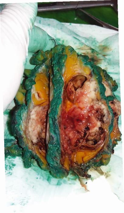 Фрагмент грудной железы с опухолью разрезан и предварительно выкрашен тушью (зеленой на этот раз), чтобы под микроскопом однозначно можно было оценить линию (и глубину) эктомии.