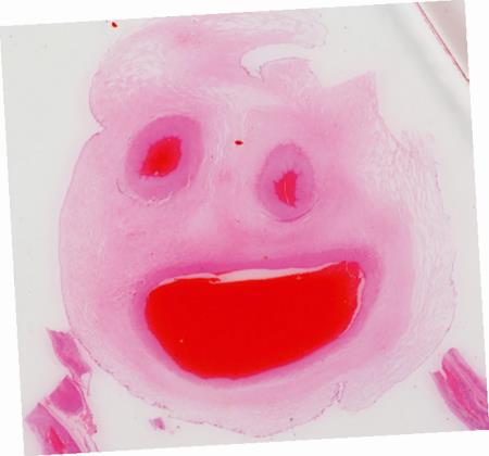 И другие чудеса: тут и там выглядывают оленьи рога тонкостенных кровеносных сосудов, характерные для онкологических заболеваний из группы гемангиоперицитом. Среди железистых спиралей прячутся клетки слизисто-клеточной карциномы желудка – такие невинные кольца с глазком, как милые и быстрые проворные головастики, смахивают пот с аденомы (сирингома) среди коллагеновых потоков дермы. Ряды надгробий отмечают основание внутрикожных пузырей у Pemphigus vulgaris (пузырчатка обыкновенная), свиные хвосты ободряюще машут нам из остатков чесоточных яиц, отложенных в эпидермальной норке, тактильные тела Пачини возникают в слоях и напоминают лук Шрека или осла из мультика. И все это просто стандартные литературные сравнения и метафоры прямо из учебников и медицинских публикаций. На фоне этого красочного пейзажа наши невинные патологические игры бледнеют – что удивительного в том, чтобы искать лица в опухолях печени, сердца в кровеносных сосудах или лимфатических узлах или видеть под микроскопом игривого щенка в розовых полях рака вульвы.