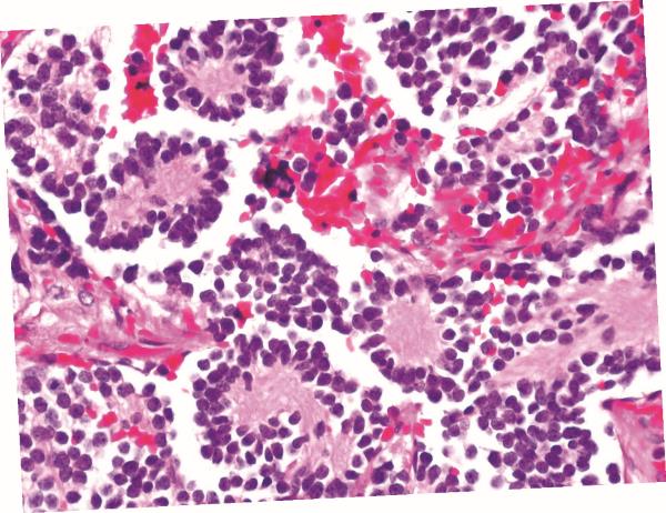 Розетки Гомера Райта, заполненные розовым микроволокном, – нейробластома надпочечников.