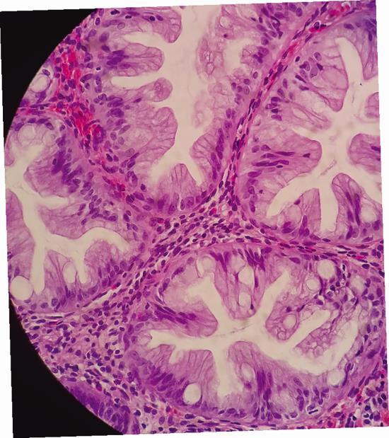 В то время как папиллярный рак смотрит на нас пустым взглядом героини комиксов, иногда толстая кишка может взорваться под микроскопом целым фейерверком разных цветов. Возможно, вы знаете, что не все полипы, обнаруженные в кишечнике, раковые, есть и доброкачественные. Гиперпластические полипы, непреодолимо ассоциирующиеся (под микроскопом, конечно) с изображением цветущего луга, отмечаются довольно часто, а с возрастом все больше и больше. В учебниках говорится, что их можно найти как минимум у 35 % людей старше 50 лет, вообще не имеющих жалоб, связанных с пищеварением. Из-за цветочного или согласно некоторым представлениям «зубастого» изображения патологически измененных кишечных желез, которые на самом деле невелики, категория полипов, к которой мы их относим, получила название зубчатых полипов, а гиперпластические полипы – самые многочисленные, а также наименее опасные представители группы полипов. Вы знаете термин «апоптоз»? Это процесс плановой гибели клеток, постоянно происходящий в различных частях нашего тела и необходимый для его правильного функционирования. Что ж, процессы умирания, происходящие в кишечных железах, считаются одним из важных факторов развития таких цветов. Это, конечно, определенное упрощение, но кишечные крипты (углубления) – довольно активные места, на их поверхности микротрубочек слизистой оболочки кишечника постоянно образуются новые эпителиальные клетки, которые по мере взросления поднимаются и постепенно отмирают. Считается, что это клеточное «коловращение» нарушается в гиперпластических полипах, отсюда и избыток клеток, которые наслаиваются в такие напоминающие зубчики и цветки формы. Такие вот зубастые цветочки.