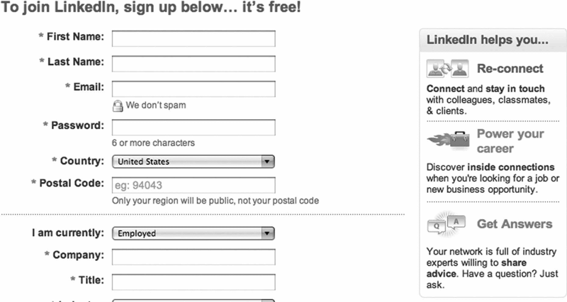 Рис. 2.1. Социальная сеть LinkedIn четко перечисляет преимущества регистрации в пункте LinkedIn helps you (LinkedIn поможет вам)