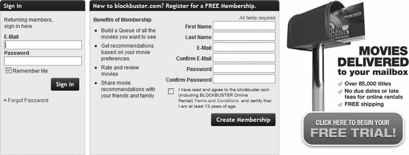 Рис. 2.3. Сайт Blockbuster перечисляет преимущества регистрации на Blockbuster.com и предлагает «бесплатный» пробный период каждому регистрирующемуся