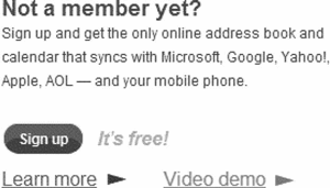 Рис. 2.4. Сервис Plaxo размещает описание преимуществ регистрации рядом с кнопкой регистрации, и, что весьма оригинально, сайт предоставляет пользователям возможность узнать больше, посмотрев демонстрационный или обучающий ролик