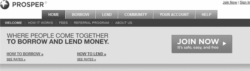 Рис. 2.5. Сайт Prosper (где можно дать или взять взаймы деньги) предоставляет информацию о том, как можно взять или дать деньги в долг с помощью ссылок How to borrow (Как взять в долг) и How to lend (Как дать взаймы)