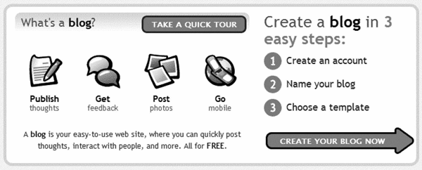 Рис. 2.6. Помимо перечисления преимуществ ведения блога (описание своих мыслей, получение комментариев и т. д.) сайт Blogger предоставляет информацию о ведении блога с помощью функции Take a Quick Tour(Короткий тур)