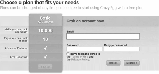 Рис. 2.7. Для регистрации на сайте Crazy Egg пользователи должны заполнить всего три поля и принять условия использования и политику конфиденциальности. Более того, благодаря объединению формы с соответствующими преимуществами, пользователи точно знают, чего им ожидать