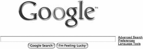 Рис. 2.9. Форма поиска у Google самая простая и короткая. Хотя в нее входит кнопка I'm Feeling Lucky (Мне повезет!), большинство людей обычно вводят ключевые слова и щелкают по кнопке Google Search (Поиск в Google) или нажимают клавишу Enter на клавиатуре