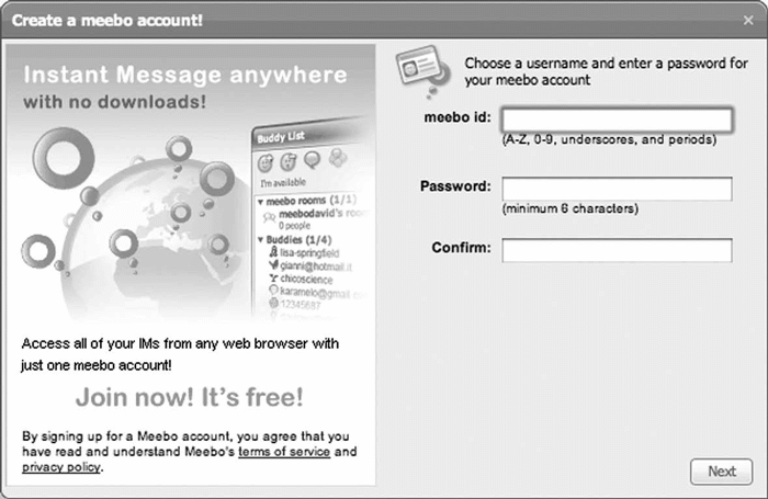 Рис. 2.11. На сайте Meebo регистрационная форма разделена на несколько страниц. Самая важная часть формы располагается вначале, а на остальных страницах пользователи могут установить дополнительные настройки своей учетной записи и указать свои предпочтения