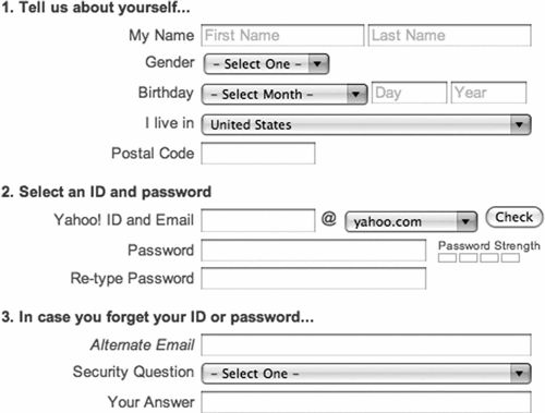 Рис. 2.12. Yahoo! разделяет элементы регистрационной формы на логические группы, благодаря чему создается впечатление, что форму можно легко и быстро заполнить
