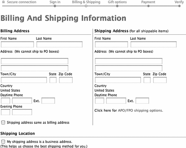 Рис. 2.13. Форма оформления заказа на сайте Apple кажется удобной для заполнения, во-первых, благодаря тому, что она разделена на несколько страниц, а во-вторых, благодаря логической группировке элементов на каждой странице
