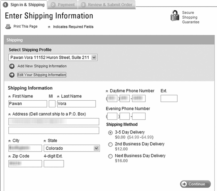 Рис. 2.14. Приложение Dell, как и многие другие приложения для электронной коммерции, отображает информацию о доставке и о платежах отдельно друг от друга, чтобы формы казались короче и пользователи уделяли отдельное внимание каждой порции информации
