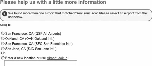Рис. 2.24. На сайте Expedia пользователям предлагается выбрать один аэропорт из нескольких вариантов, когда введенные данные (в данном примере Сан-Франциско) могут трактоваться по-разному