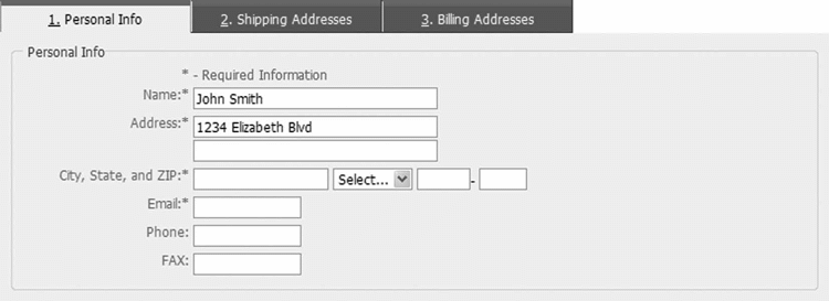 Рис. 2.26. В этом примере пользователи могут перемещаться по форме с помощью клавиши Tab, а также переходить от закладки к закладке с помощью сочетаний клавиш. Например, на вкладку Billing Address (Адрес для выставления счета) можно перейти, нажав сочетание Alt+3 (Windows) или Ctrl+3 (Mac)