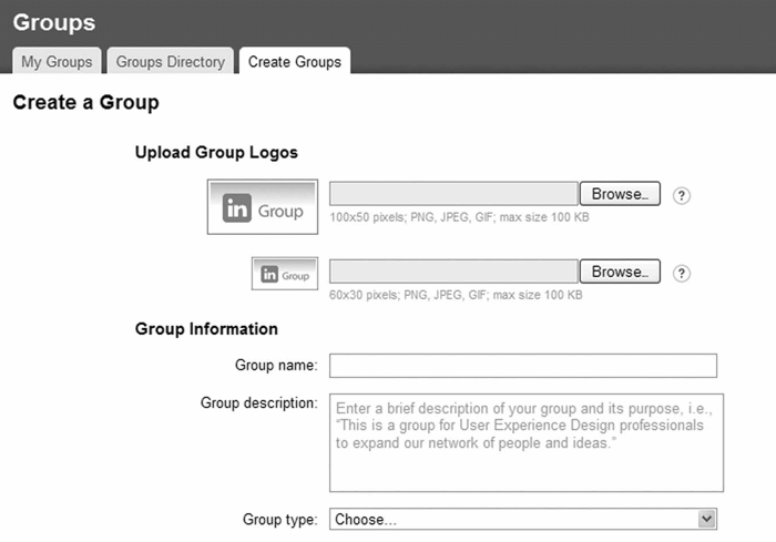 Рис. 2.27. При создании группы на сайте LinkedIn пользователи получают необходимые подсказки и инструкции по загрузке логотипов группы, описание таких требований, как размеры изображения, форматы и размеры файлов, а также здесь показан пример описания группы, встроенный в поле для ввода текста