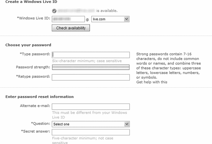 Рис. 2.28. При заполнении регистрационной формы Windows Live пользователи получают инструкции по вводу пароля, альтернативного электронного адреса и секретного вопроса. Кроме того, когда пользователи приступают к заполнению поля, им предоставляется дополнительная информация и возможность получить помощь, пройдя по специальной ссылке