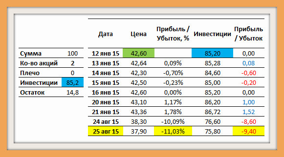 Посмотрите на таблицу №1. У нас есть сумма 100 долларов10. В тот момент, когда мы собираемся купить акции компании Д, их цена составляет 42,60 долларов. Эта ячейка в таблице выделена зеленым фоном. Мы решаем купить 2 акции этой компании, и наши инвестиции составляют 85,20 долларов. Эта ячейка в таблице выделена синим фоном. В строке плечо стоит цифра «0». Это означает, что мы совершает инвестиции только на свои деньги, без плеча.