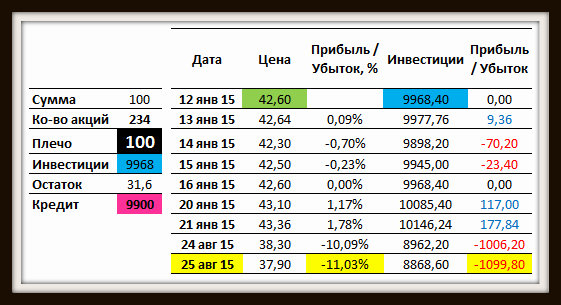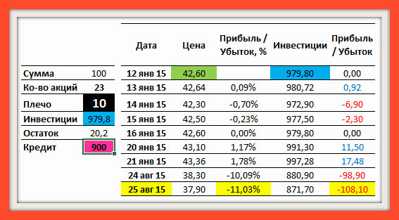 Взгляните на таблицу №2. Благодаря заемным средствам в размере 900 долларов, ячейка выделена красным фоном, вы теперь можете инвестировать в акции 1000 долларов. На них вы купили 23 акции компании Д. Ваши инвестиции выросли в 10 раз, а ваше плечо теперь равно 10. Цена на акции компании движутся так же, как и в предыдущем варианте, но к моменту «Х» ваш результат составит «минус» 108,10 долларов. Вы потеряете все ваши деньги и останетесь еще должны брокеру больше 8 долларов.